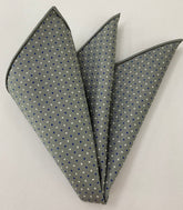 See DetailsBlue & White on Gray Macclesfield Printed Silk Pocket Square MCP-143100% twill silk printed in Macclesfield, England. Approximately 15 inches square. Our pocket squares have beautiful hand rolled edges and mitered corners.Estimated number that can be made: 1 item(s)