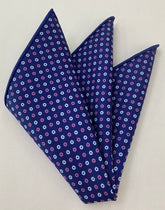 See DetailsBlue & White on Midnight Blue Macclesfield Printed Silk Pocket Square #MCP-160100% twill silk printed in Macclesfield, England.Approximately 15 inches square.Our pocket squares have beautiful hand rolled edges and mitered corners.Estimated number that can be made: 2 item(s)
