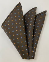 See DetailsYellow Gold & Off White on Chocolate Macclesfield Printed Silk Pocket Square MCP-46100% Silk printed in Macclesfield, England. Approximately 13 inches square. Our pocket squares have beautiful hand rolled edges and mitered corners.Estimated number that can be made: 1 item(s)