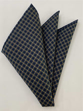 See DetailsYellow Gold on Midnight Blue Macclesfield (small) Printed Silk Pocket Square #MCP-65100% Silk printed in Macclesfield, England.Approximately 13 inches square.Our pocket squares have beautiful hand rolled edges and mitered corners.Estimated number that can be made: 1 item(s)