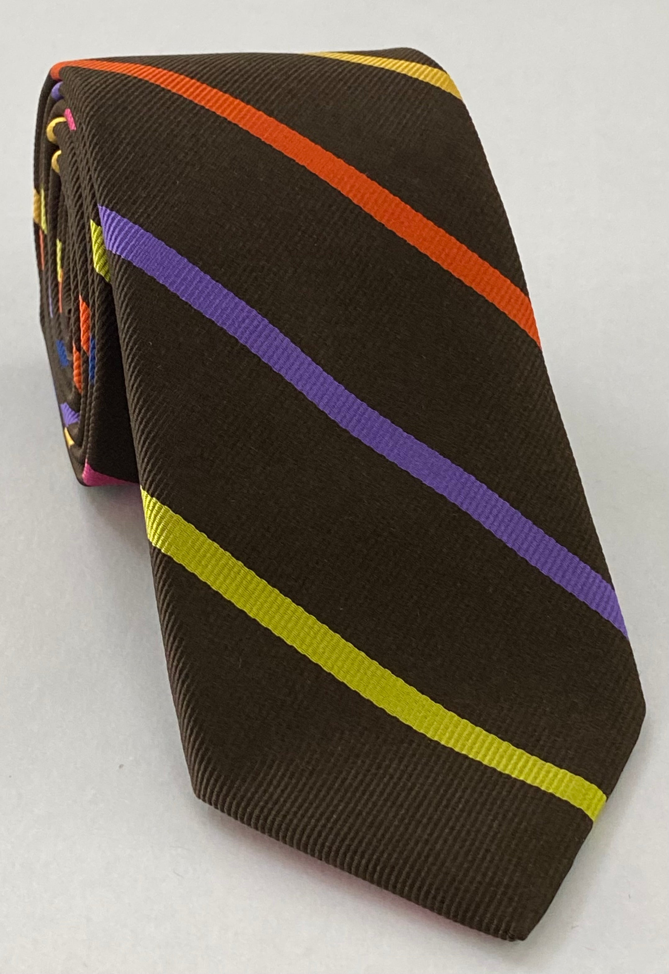 Blue, Yellow Corn, Orange, Lavender, Young Leaf Green & Fuchsia on Bitter Chocolate Reppe Stripe Silk Tie RST-57