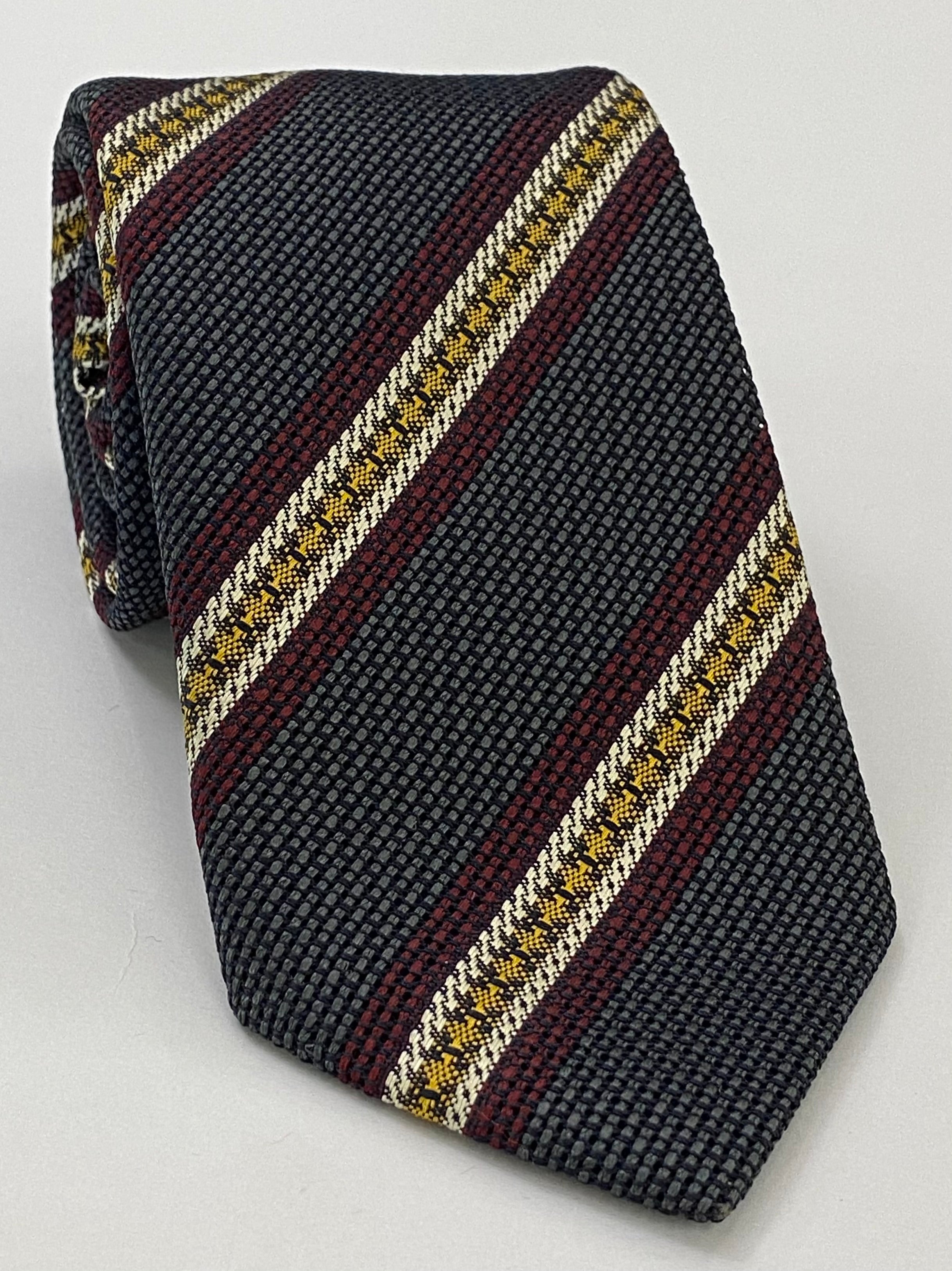 Dark Red, Yellow & Off-White on Charcoal Gray Grenadine Fina and Grossa Stripe Silk Tie 1