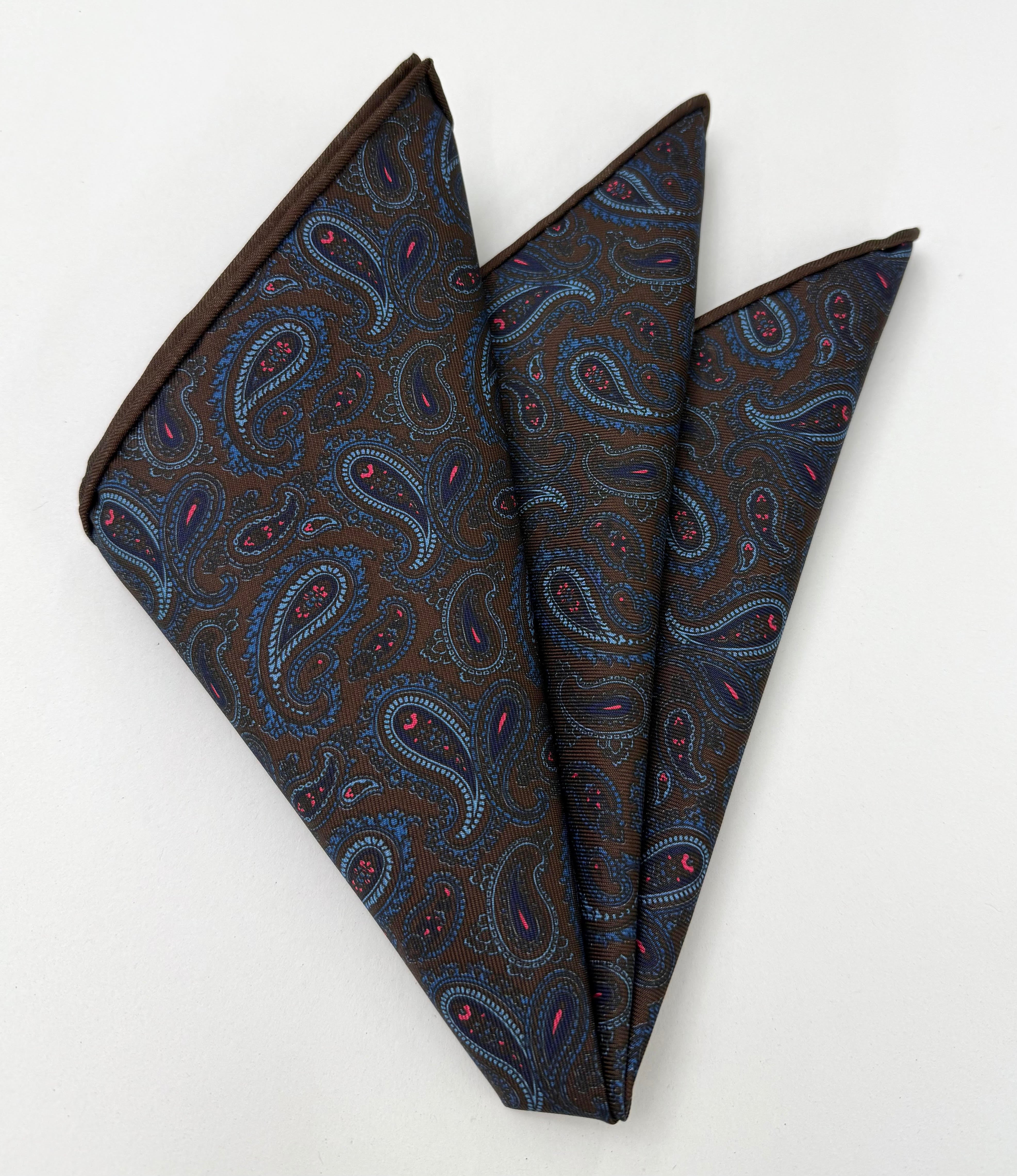 Navy Blue, Fuchsia, Powder Blue, Sky Blue on Dark Chocolate Macclesfield Print Silk Pocket Square #MCP-398