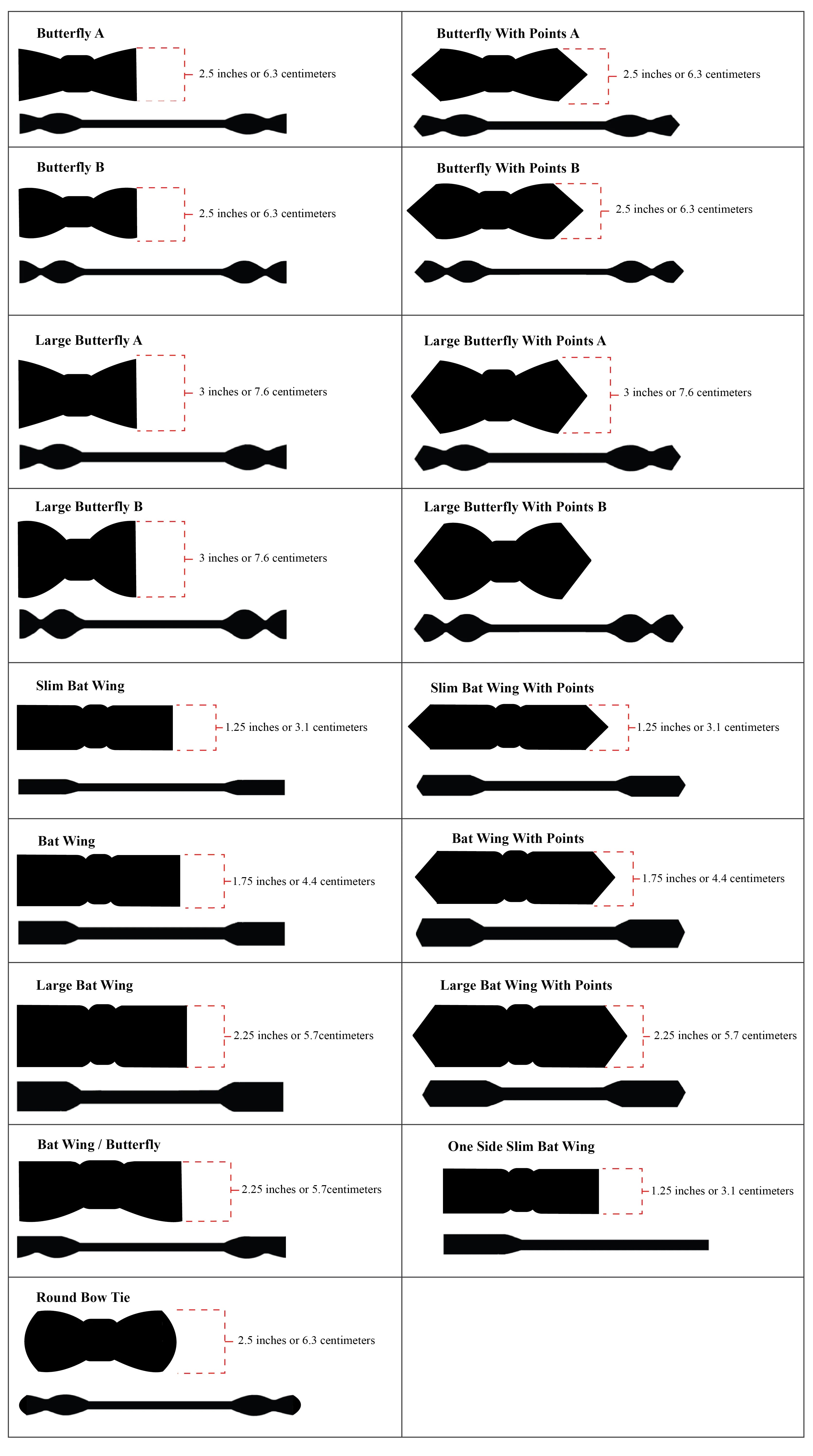 Note that there are many variations in how your bow tie can be designed and measured. If you are using an old bow tie to measure from - remember your old bow tie nay have stretched.